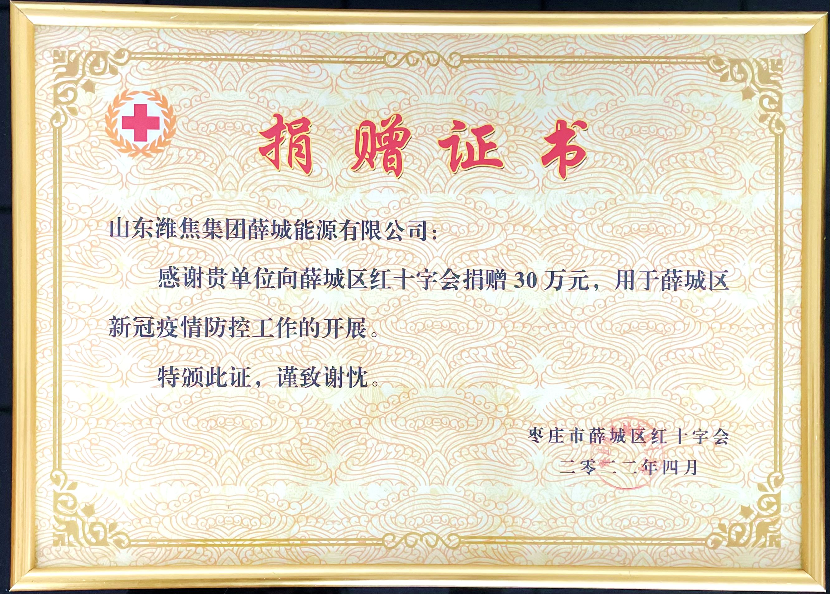 4月11日,薛城能源公司收到棗莊市薛城區(qū)紅十字會(huì)頒發(fā)的捐贈(zèng)證書及區(qū)委統(tǒng)籌疫情防控和經(jīng)濟(jì)運(yùn)行工作領(lǐng)導(dǎo)小組發(fā)來(lái)的感謝信,感謝企業(yè)為地區(qū)疫情防控慷慨捐贈(zèng)30萬(wàn)元!